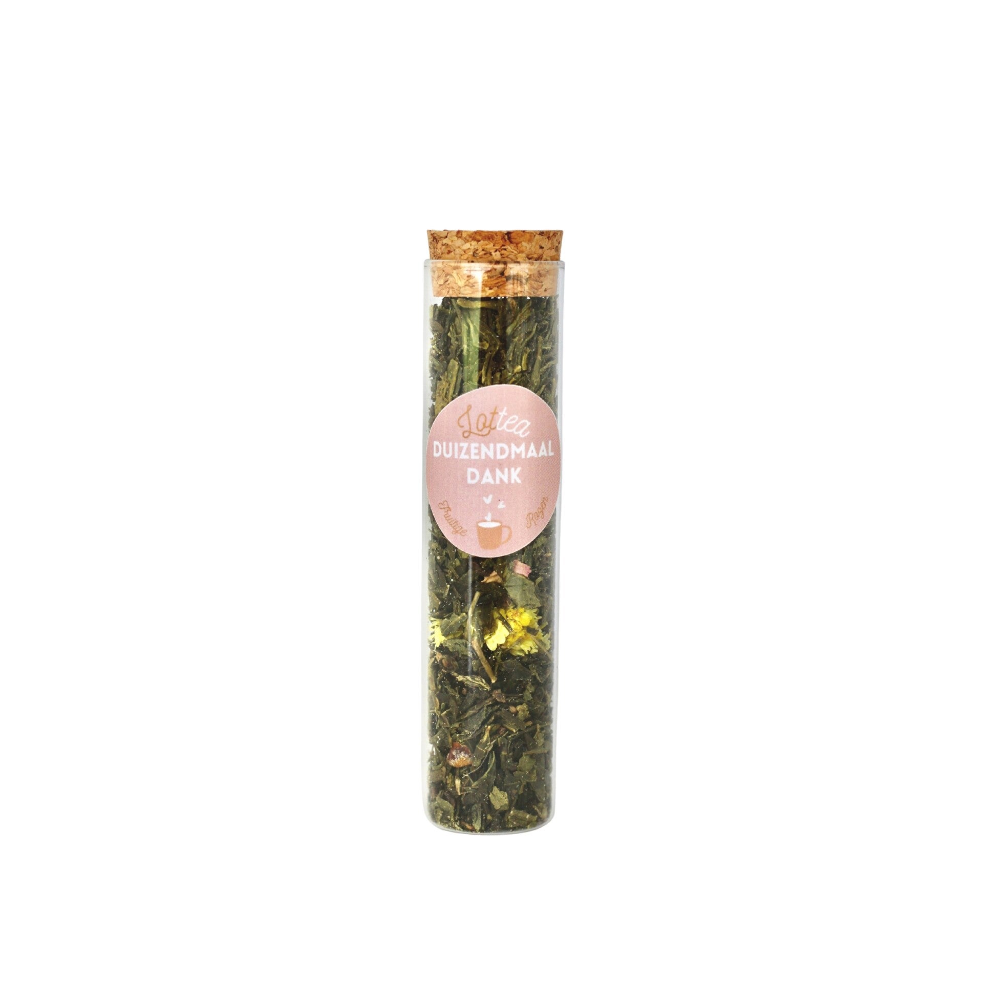 Lottea Duizendmaal Dank thee is een erkentelijke, bewonderende Groene thee met dadel, rozenkransje en rozenblaadjes. De basis van deze gearomatiseerde Duizendmaal Dank thee is Groene Thee China Sencha: een zachte groene thee van hoge kwaliteit, met een rijke maar milde smaak. China Sencha thee heeft een mooi lichtgroen, strookvormig blad. Het vormt een mooie basis voor de andere ingrediënten in deze thee en laat alle smaken tot volle ontwikkeling komen.