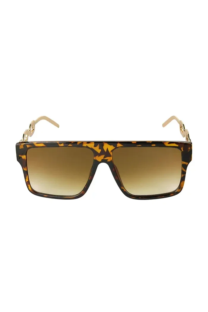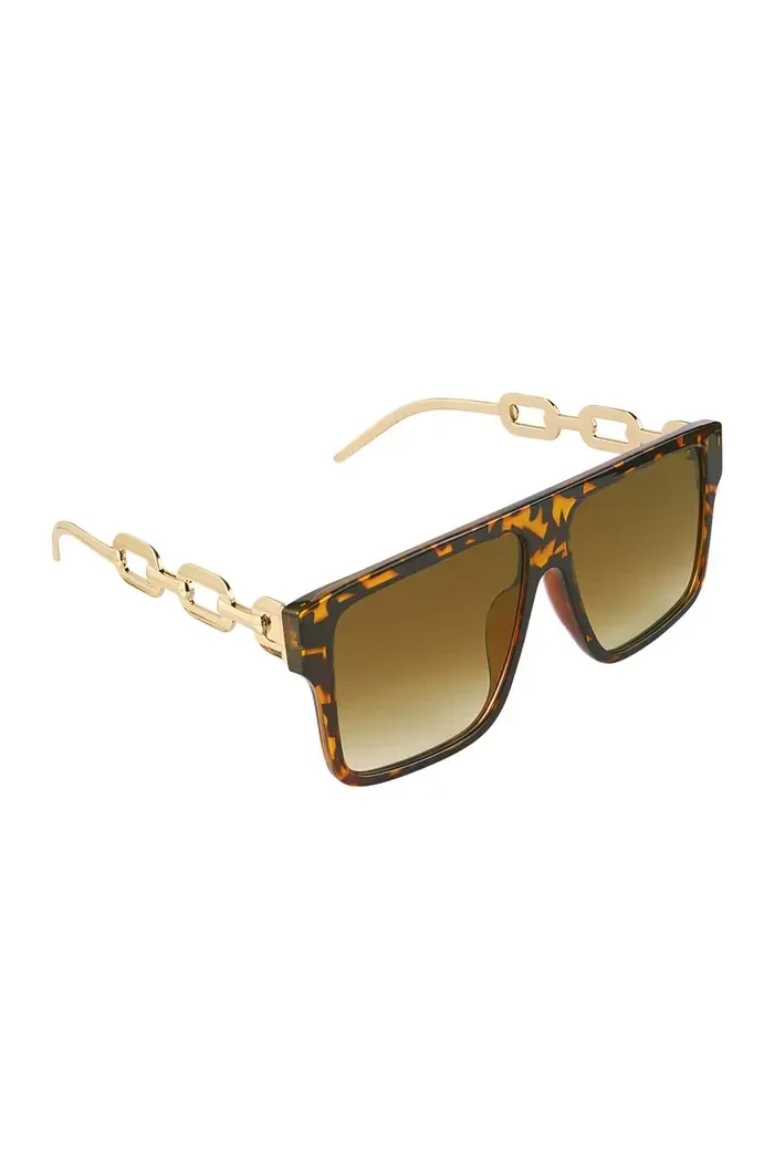 Wauw! Hoe gaaf is deze prachtige bruin met print zonnebril met gouden schakeldetails in de pootjes. Super trendy en perfect voor een dagje strand of terras! De zonnebril is perfect te combineren met bijvoorbeeld een leuke hoofdband of kleurrijke tas! Ook leuk om deze zonnebril te combineren met statement oorbellen. De zonnebril is gemaakt van PC