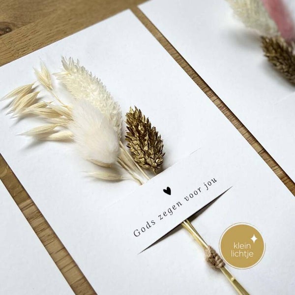 Je kunt de kaart in een kaarthouder neerzetten of eventueel de droogbloemen uit de kaart halen en in een klein vaasje neerzetten.