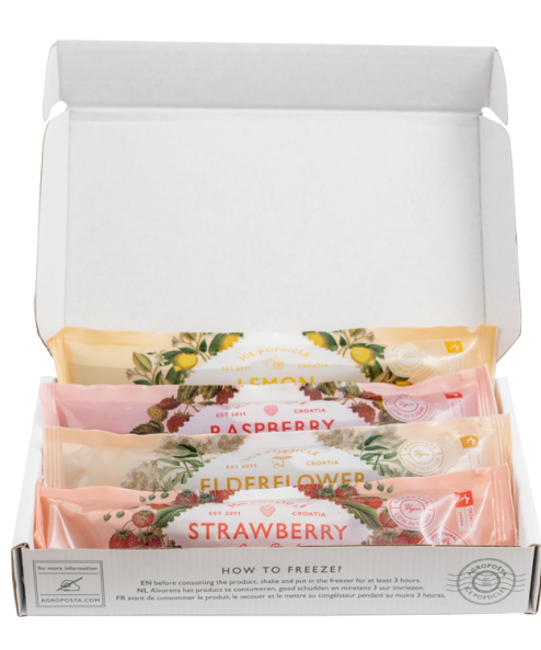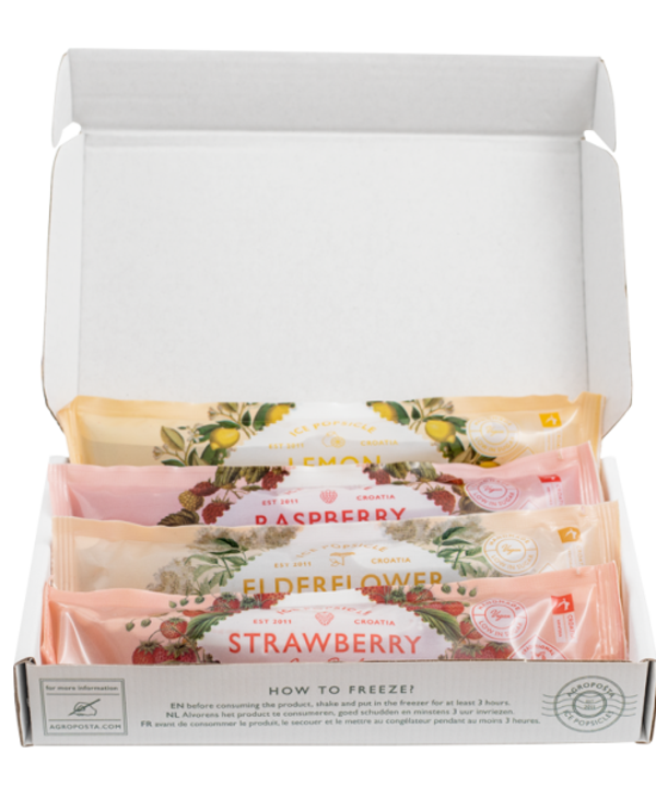 Deze giftbox bevat 4 Agropošta ijslolly’s in de smaken aardbei, framboos, citroen en vlierbloesem. De giftbox past door de brievenbus dus ideaal om te versturen. Postzegels er op en klaar!