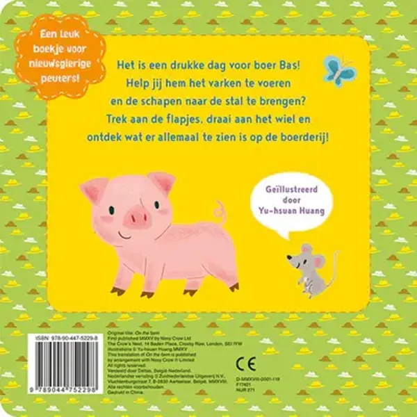 Het is een drukke dag voor boer Bas! Help jij hem het varken te voeren en de schapen naar de stal te brengen? Trek aan de flapjes, draai aan het wiel en ontdek wat er allemaal te zien is op de boerderij! Een leuk boekje voor nieuwsgierige peuters